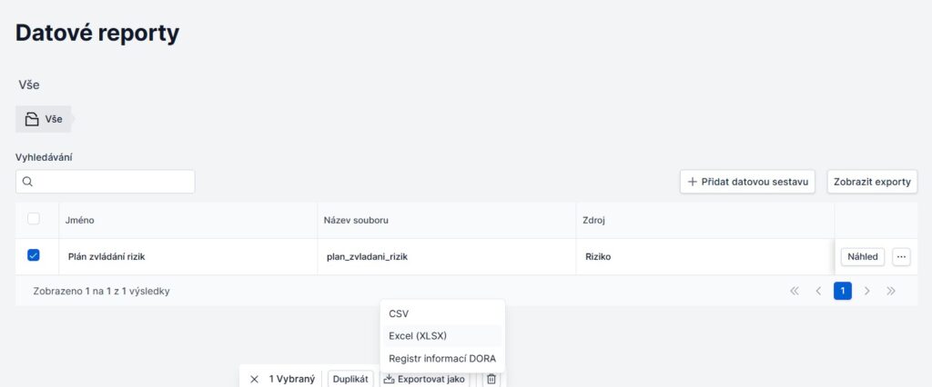 Výsledný plán si můžete jednoduše vygenerovat v sekci Zprávy a následně exportovat (např. do Excelu nebo CSV) jako hotový dokument připravený pro audit, kontrolu nebo interní řízení bezpečnosti.