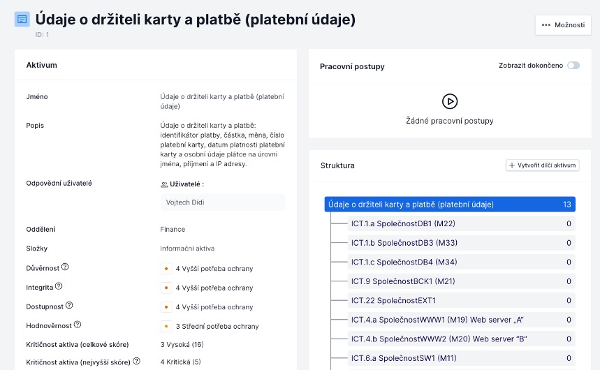 Jedním z typických problémů v Excelu je, že organizace vlastně přesně neví, co všechno má chránit. Aktiva, procesy a jejich vazby existují, ale nejsou systematicky propojené. V cybregu se tyto vztahy modelují přímo v systému. Každé aktivum má svého vlastníka, hodnotu a vazbu na konkrétní procesy. Díky tomu je možné okamžitě vidět, které části organizace jsou kritické a jaké dopady by měl jejich výpadek.