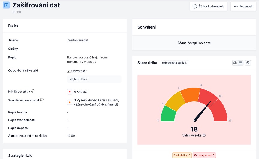 Další typický scénář je práce s riziky. V Excelu se rizika často evidují izolovaně a jejich vyhodnocení je manuální. Jakmile se změní například hodnota aktiva nebo pravděpodobnost hrozby, je potřeba vše přepočítat. V cybregu jsou rizika navázaná na aktiva i procesy a systém automaticky počítá jejich výslednou úroveň na základě dopadu a pravděpodobnosti.